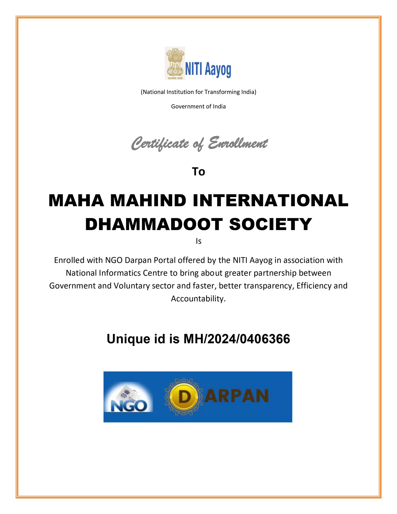 MAHA MAHIND International Dhamadoot Society Reg No : CSR 00071944-12AA/80G Niti ayog Unique ID : MH/2024/0406366